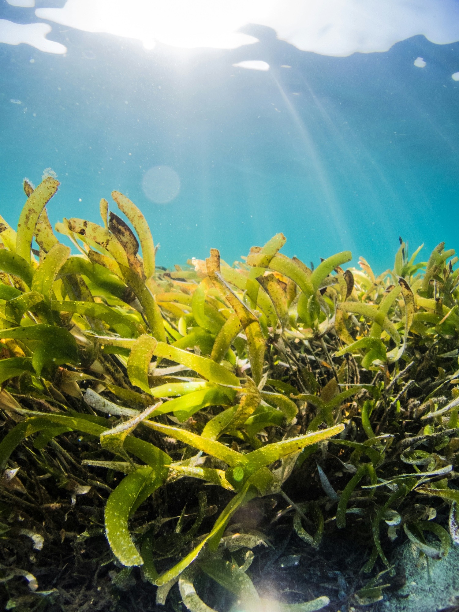 Seegras nutzt den Kohlenstoff(C) aus dem CO2 für den Aufbau seiner Blätter und gibt den Sauerstoff (O2) wieder an die Umgebung ab.